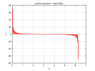 %while循环 x=0:0.01:2*pi,y=0; %定义x的范围 indx=1; while indx<=100 %判断条件,满足则下一步,否则直接结束 y=y+sin(indx*x); indx=indx+1; end plot(x,y,'r-'); %绘制y的函数图像,并设置线为r(红色)实线型 title('y=sinx+sin2x+…+sin100x'); %对图像主题的说明 xlabel('n'); %对横轴进行说明 ylabel('y'); %对纵轴进行说明 grid on; %打开图像网格2.实验结果