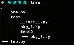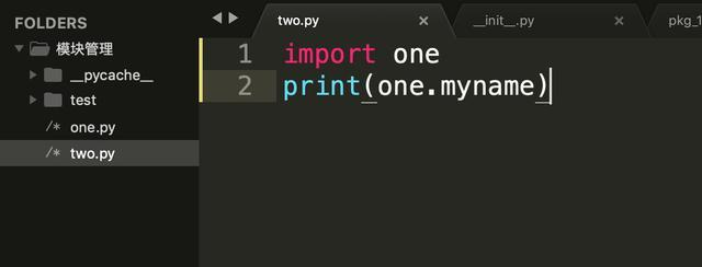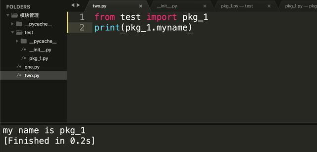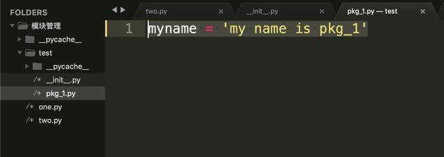 one.py和two.py在根目录,test目录下有一个pkg_1.py和__init__.py的文件。