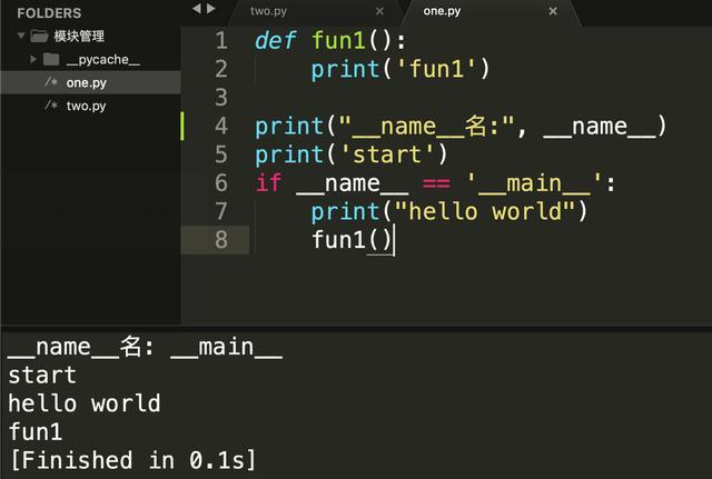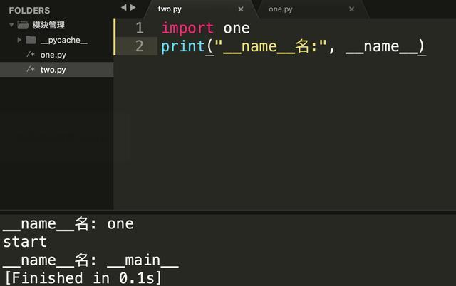 我对刚才那个one.py文件做了下改进,增加了一行代码,用于打印了当前模块的__name__ 值。