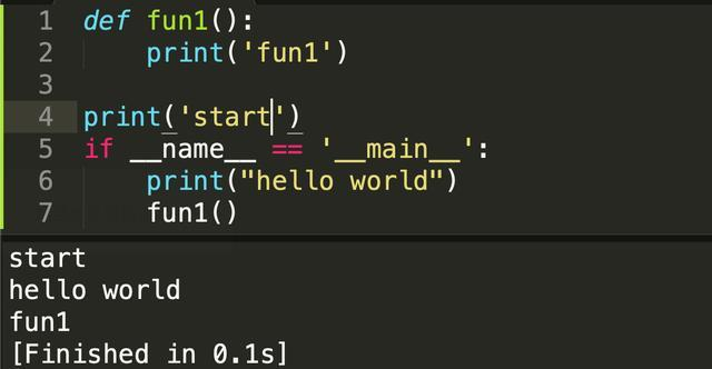 首先运行程序后会执行第4行的print(‘start’),然后第5行用了一个逻辑判断,来定义了一个伪main函数,并且打印hello world,以及执行fun1函数。