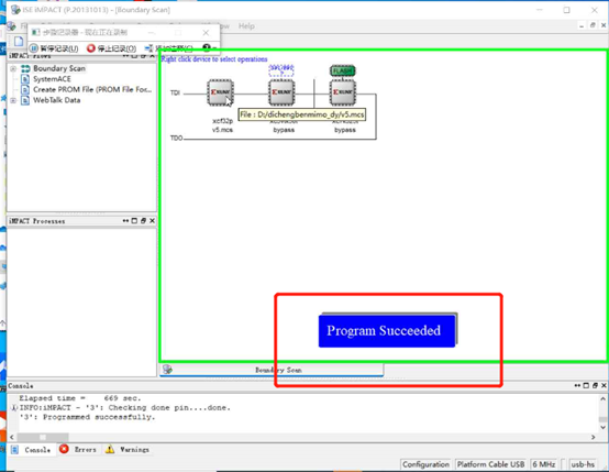 此时K7,V5均固化成功。数字板卡与JTAG线连接的地方有两个LED灯,可以通过两个灯都亮进一步判断加载/固化过程无误。