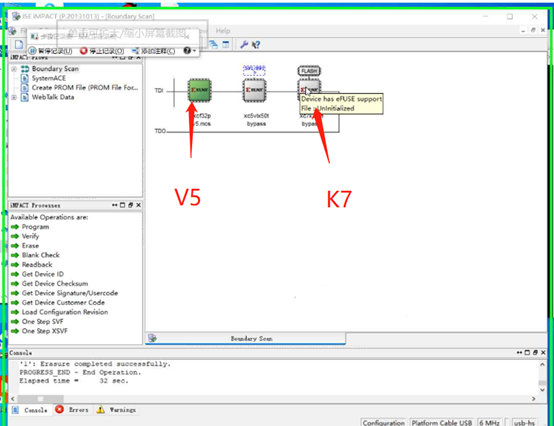 - 固化的顺序为:擦除K7,擦除V5(如果V5需要编程),编K7,编V5。(若V5不需编程,则擦K7编K7即可),每擦除/编写完一个芯片都要重新断电再上电。