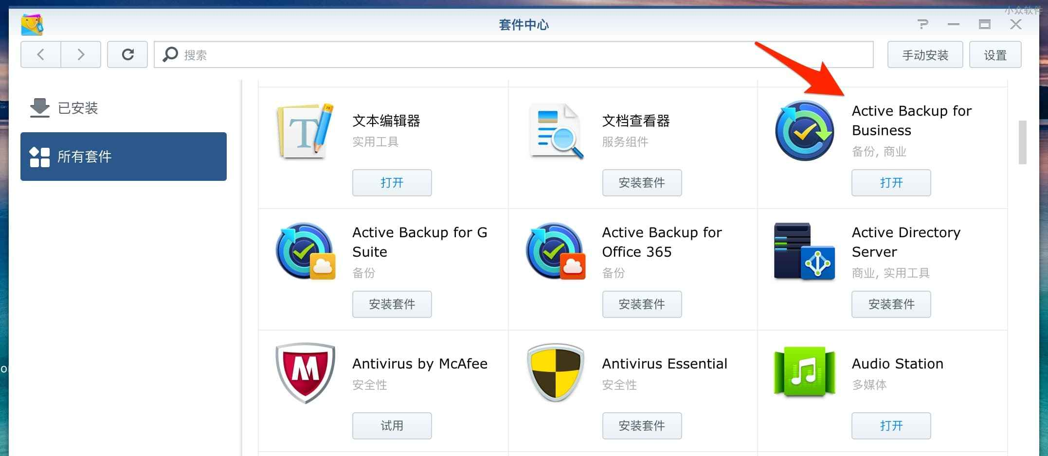 先安装套件,注意 Active Backup 有好几个,选 Business,另外两个适用于 Office 365 和 G Suite,备份云端的。