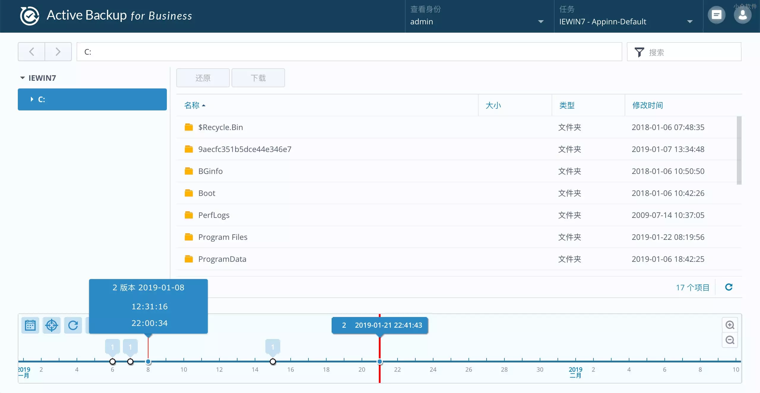 通过 Active Backup for Business Portal,就可以恢复时间轴上任意备份点的数据了。可以看到这个备份数据和硬盘上的文件结构一样。除非发生系统级别的灾难。比如 Windows 彻底挂了无法打开,否则通过 Active Backup for Business Portal 就能恢复文件: