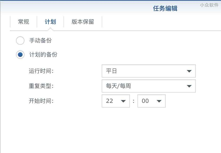 每一个备份任务的最小间隔为每小时,可根据星期来设置运行时间。