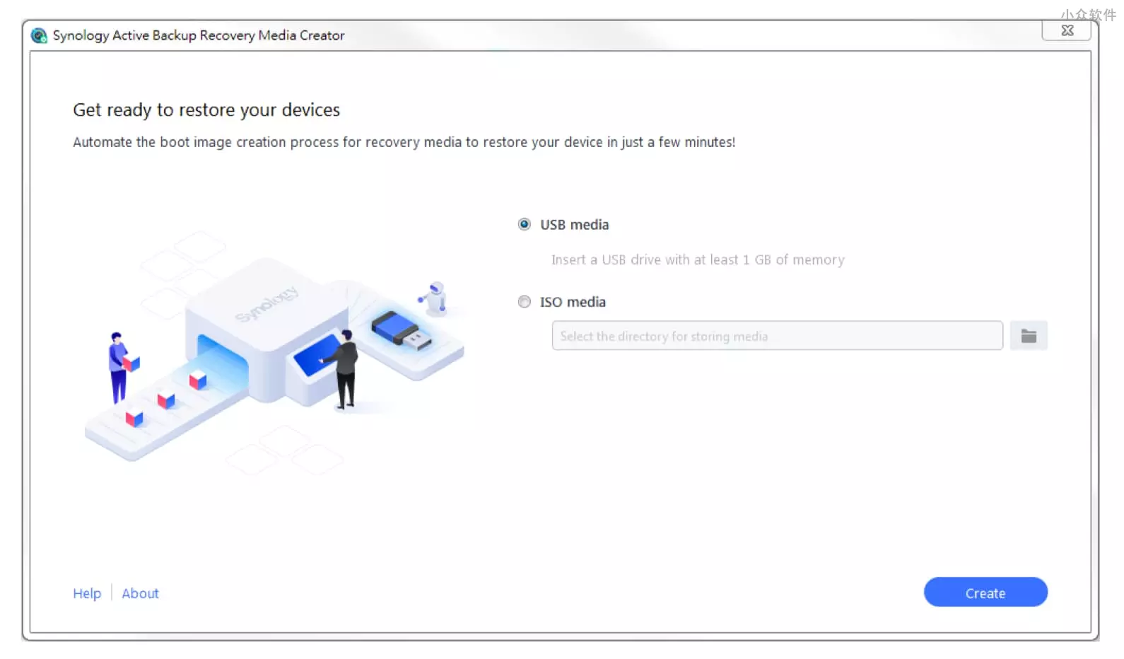 好在有一个向导式的工具 Active Backup for Business 还原媒体建立工具(下载地址)可以帮你一步一步创建一个启动盘,并带有数据恢复工具 Active Backup for Business 复原精灵,也就是说如果你有自己的 WinPE 工具,那么直接下载复原精灵也能用。