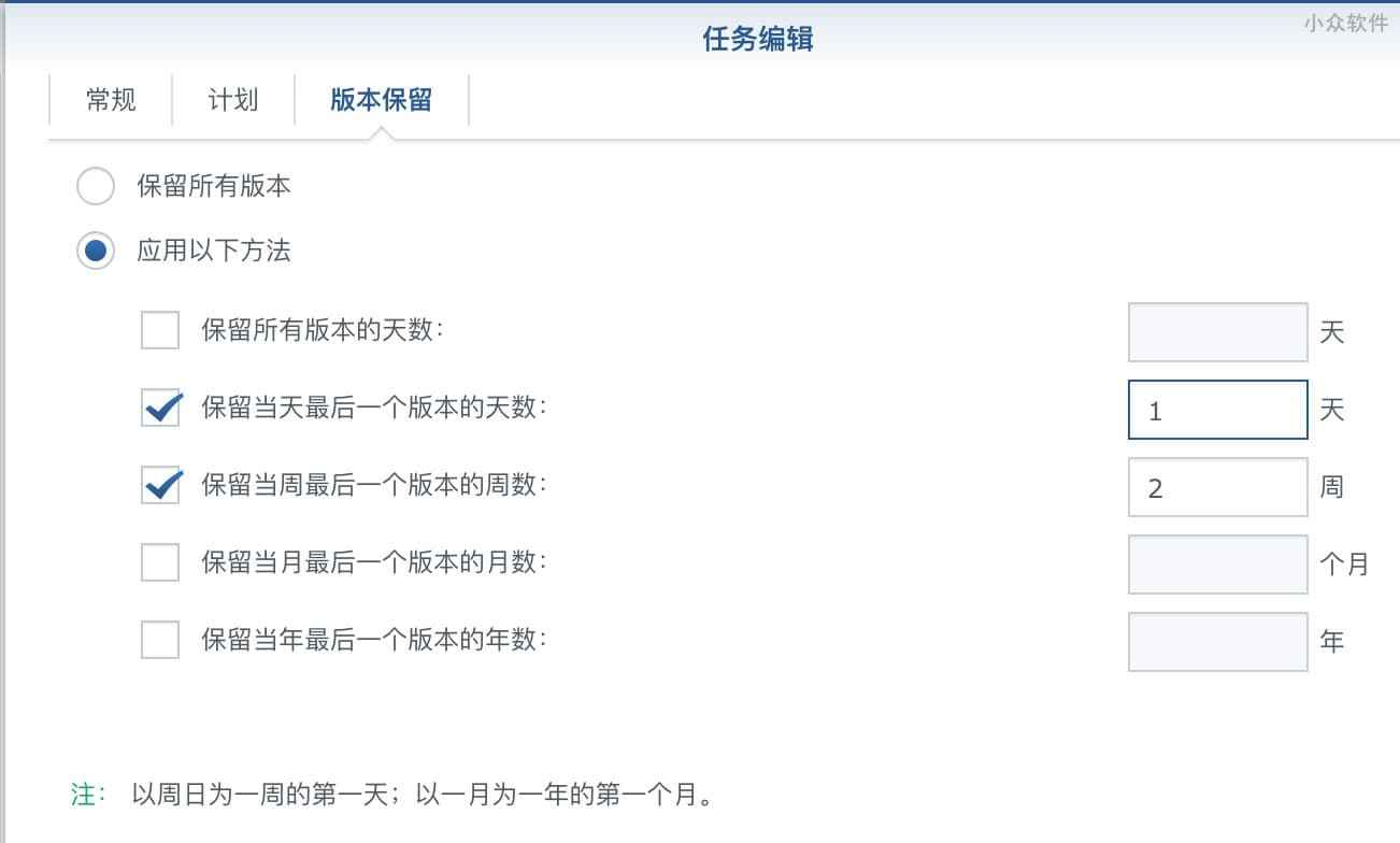 NAS 的硬盘是珍贵的,应节约每一 GB 空间。所以保留必要的备份版本就好了。Active Backup for Business 对版本的控制非常细,你可以设置保留所有版本的天数,也可以设置保留每周或者每月最后一个版本的时间。