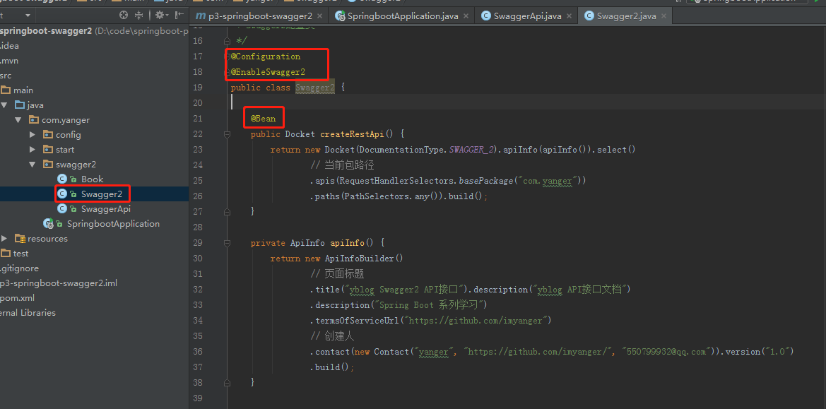 然后进行对应的配置,Swagger2默认使用配置类,这也是Spring Boot的便捷之处。