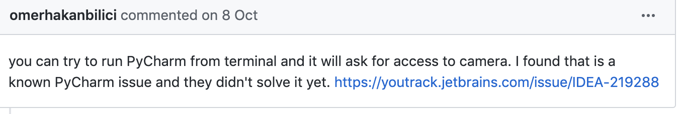 pycharm使用mac pro调用摄像头时遇到该问题,即使代码只有一行: