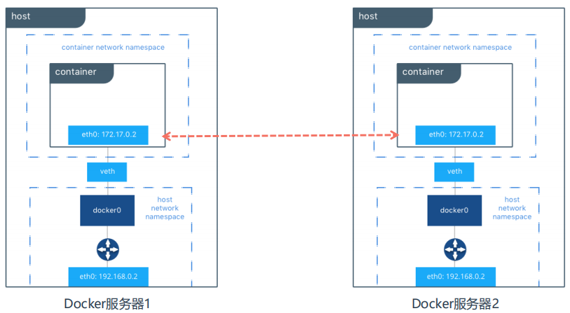Docker跨主机会分配相同的的IP,这样肯定是无法通信的,在本地ping 172.17.0.2肯定是找的该主机上面的172.0.02不会去找另外一台主机上面的容器