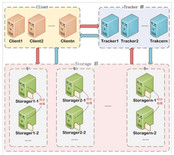 storage: 保存文件的地方。storage分为多个组,每个组之间保存的文件是不同的。每个组内部可以有多个成员,组成员内部保存内容是一样的,组成员的地位也是一致的,没有主从的概念。