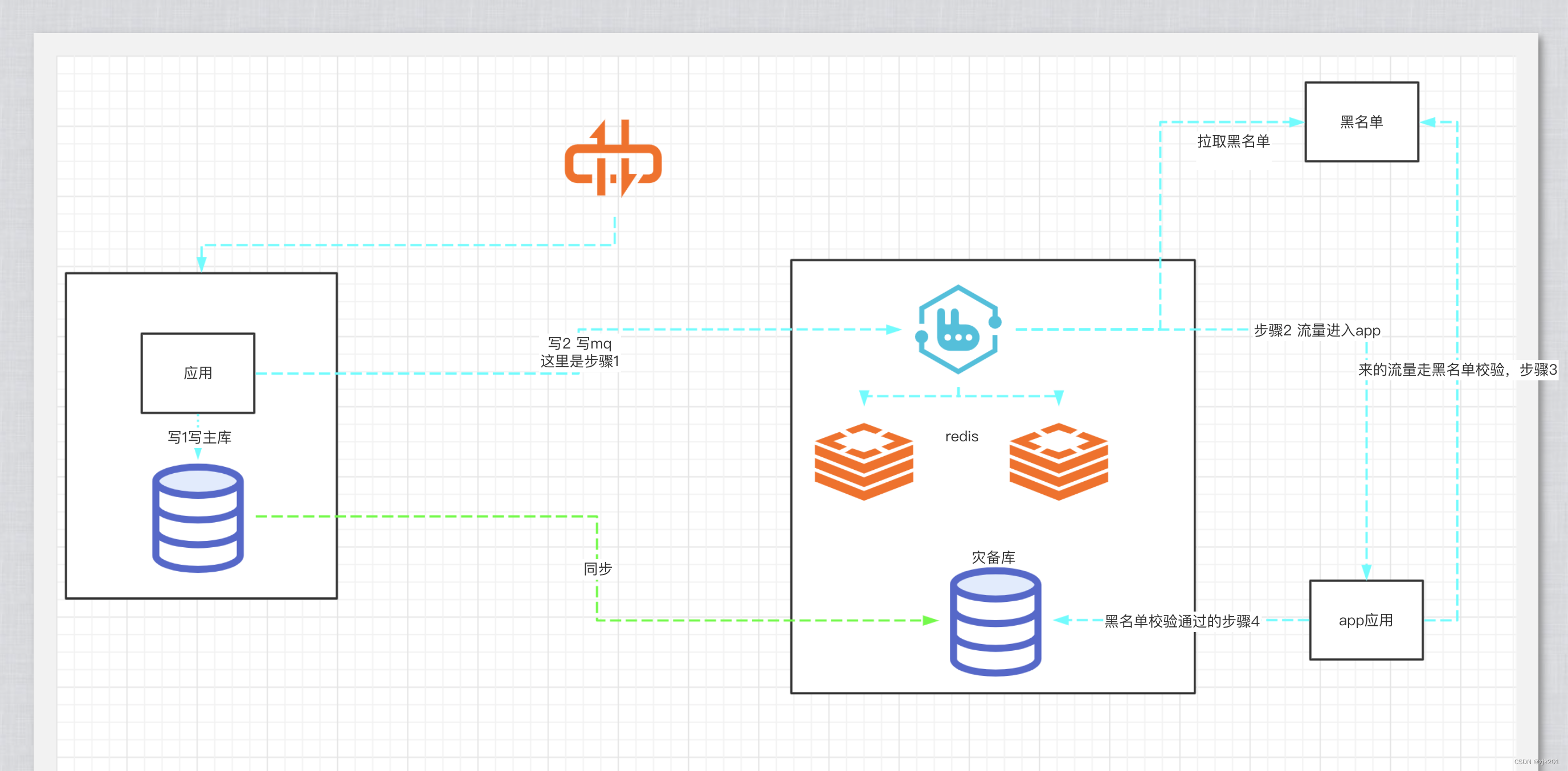 流量发过来请求 先看mq里面数据里面有没有积压,有积压就全部放入黑名单,然后开始比对,发现流量不在黑名单里面就可以进入灾备库,这可以做到分钟级切换,对时效性要求高的可以用这种。