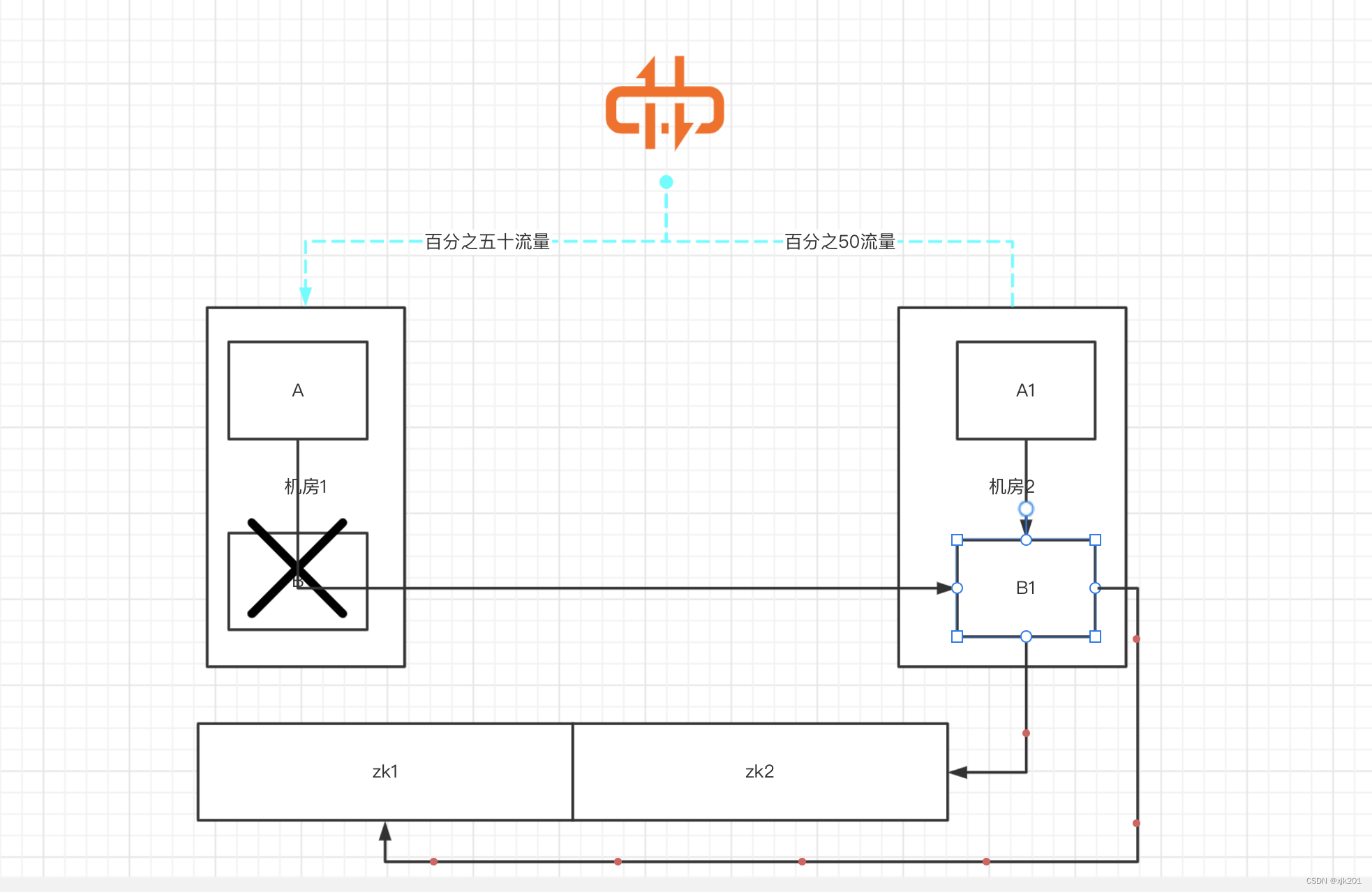 那就用zk 如下所示,b1 服务注册到机房1的zk1,这样a就可以调用机房2的b1了
