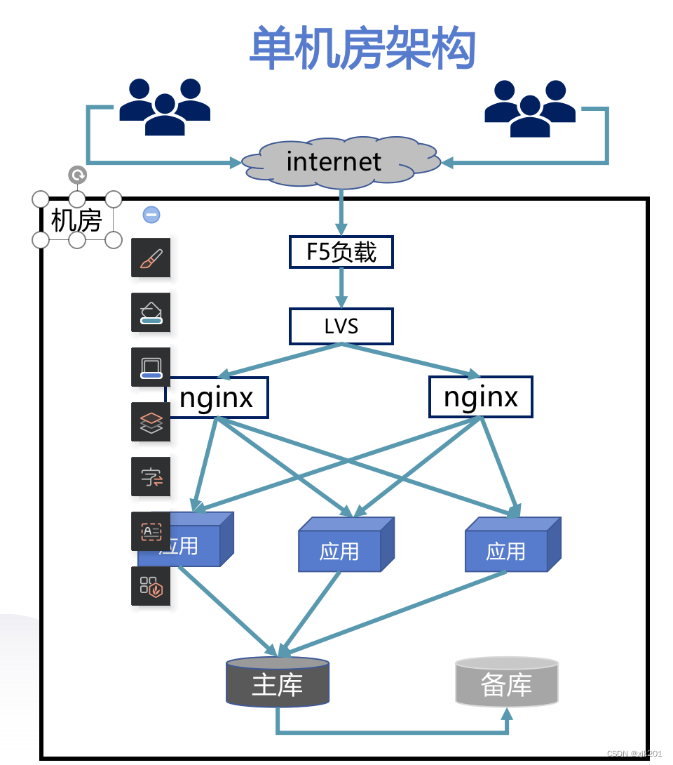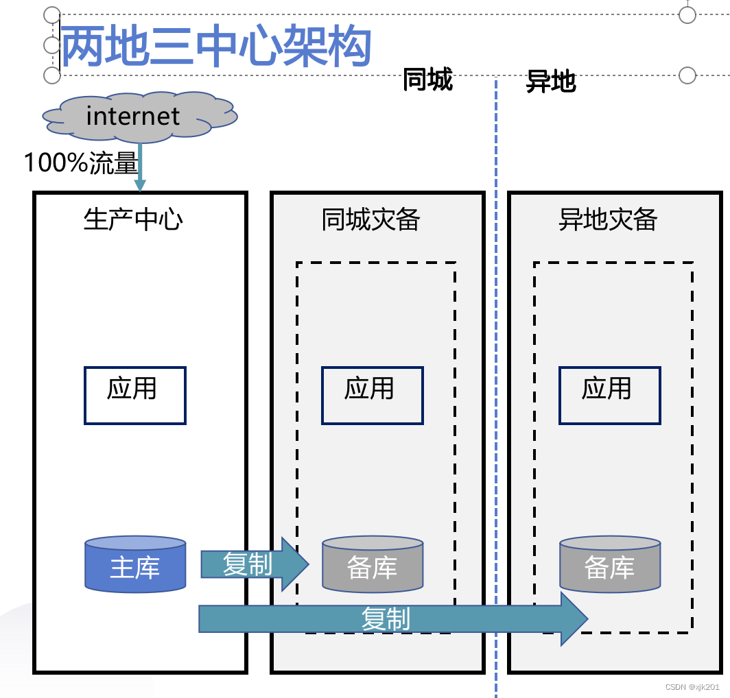 单机房 是指只有一个生产数据中心,当出现自然灾害等原因而发生故障时,应用和数据不具备容灾能力。所以演变出了下面的两地三中心架构
