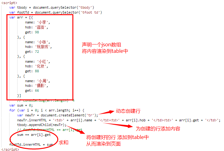js - 动态渲染table表格并填充数据 进行求和HTML代码如下: 以下是js代码:一定要记住,要想添加新的元素,一定要先进行创建 再添加求和,要先声明一个 sum = 0,再进行 +=浏览器渲染出的数据显示如下: 版权声明:本文为RR19990826原创文章,遵循CC 4.0 BY-SA版权协议,转载请附上原文出处链接和本声明。原文链接:https://blog.csdn.net/RR19990826/article/details/122599921