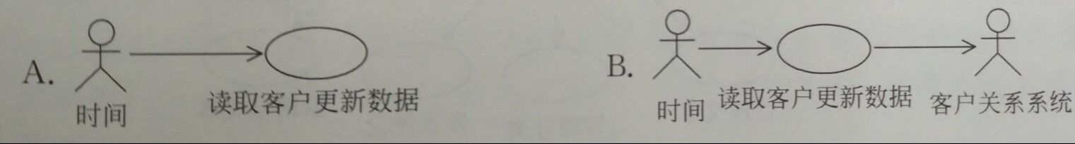 8. 某电信营销系统需要为营销人员提供各种客户数据的统计分析功能,而这些客户数据来自另一个外部系统——客户关系系统。客户关系系统定时(如24:00点)把客户数据的更新存放在某个约定的位置,营销系统也定时(如01:00点)去约定位置读取更新数据。请问以下用例图最准确地描绘了该营销系统有关客户数据更新功能需求的是(A)