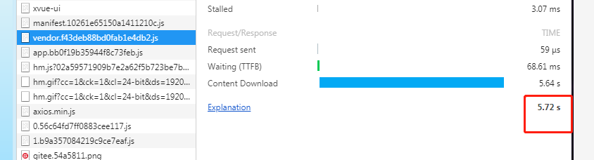 通常我们在npm run build打包项目部署到服务器上运行,会看到Network调试下有个vendor.js文件加载耗时很慢,这就导致了整个网站首次加载非常缓慢: