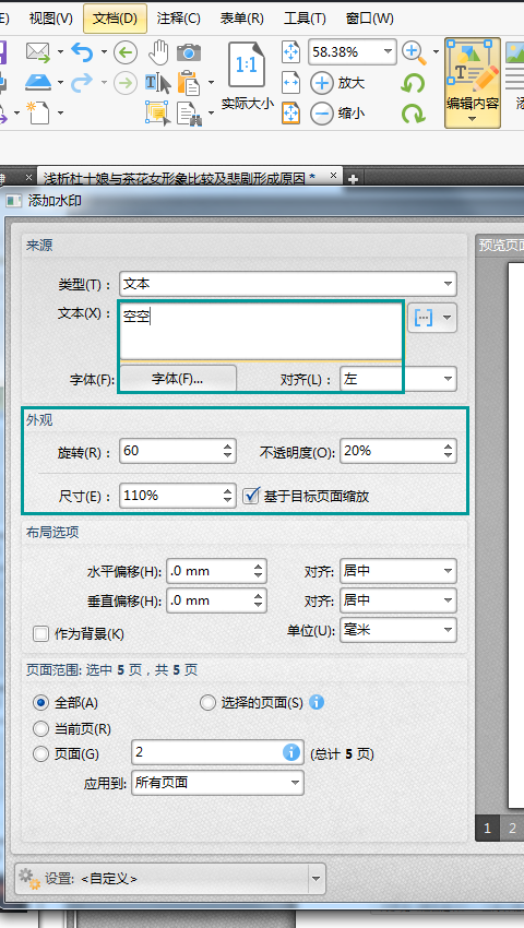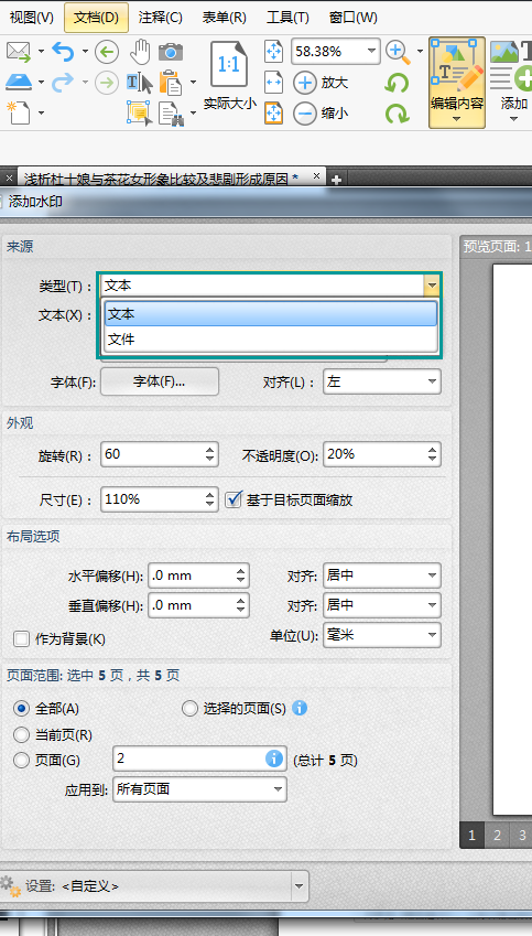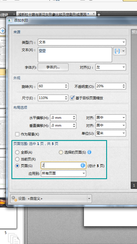 6、最后我们对添加水印页面范围进行设置,勾选全部选项所有的页面都会添加上水印,勾选当前页,只会给当前页面添加上水印。而勾选页面,可以在后面的文本框输入需要添加水印的页面页码或页面页码范围。设置好后,点击确定,完成添加。