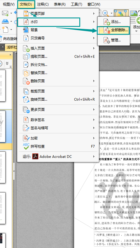 7、删除水印的方法很简单,点击界面上方的文档按钮,选择水印工具,在水印工具中的选项里点击全部删除,然后在弹出的删除水印确定菜单中点击是即可。
