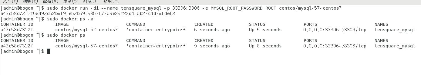 $ sudo docker run -di --name=tensquare_mysql -p 33306:3306 -e MYSQL_ROOT_PASSWORD=ROOT centos/mysql-57-centos7