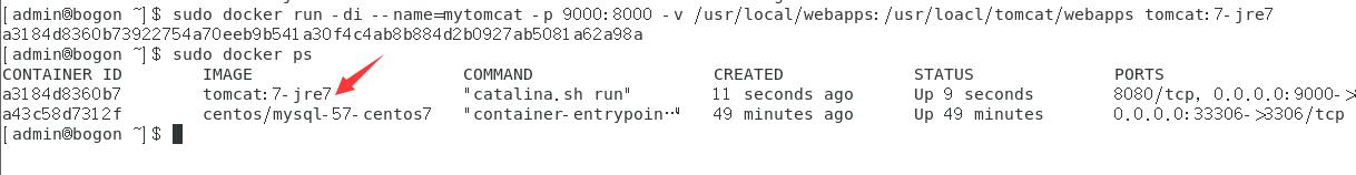 $ sudo docker run -di --name=mytomcat -p 9000:8000 -v /usr/local/webapps:/usr/loacl/tomcat/webapps tomcat:7-jre7