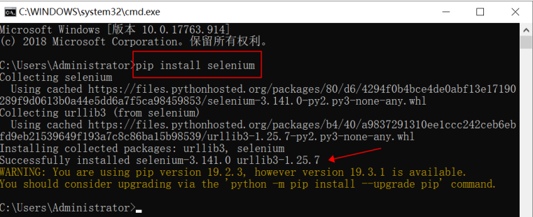 解决办法:打开部署jenkins的windows电脑,然后打开cmd窗口,在cmd窗口中输入pip install selenium,若出现selenium的版本信息,则说明安装成功(备注:cmd窗口下面出现黄色警告信息,影响不大,意思是你当前的pip命令需要升级到最新版本,可以升级,也可以不升级),selenium安装成功后,再去jenkins上“立即构建”,问题就解决了。