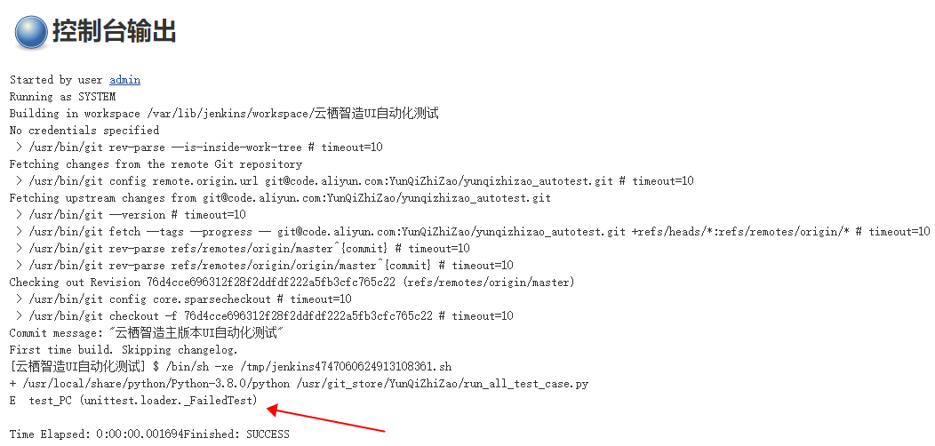 问题描述:UI自动化测试在jenkins上成功部署后,点击“立即构建”,打印日志提示:unittest.loader._FailedTest错误信息。