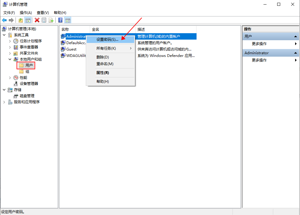 1、进入在部署jenkins的windows电脑,在电脑桌面,鼠标右键“我的电脑”—>“管理”—>"本地用户和组"—>“用户”—>"Administrator"—>“设置密码”,先给电脑Administrator用户设置一个登录密码