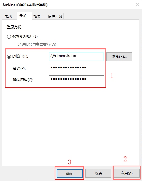 4、选择此账户,输入.\Administrator,在输入密码和确认密码,点击“应用”—>点击“确定”
