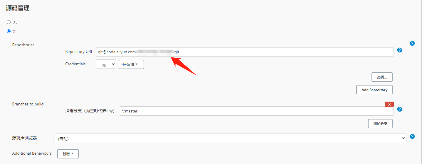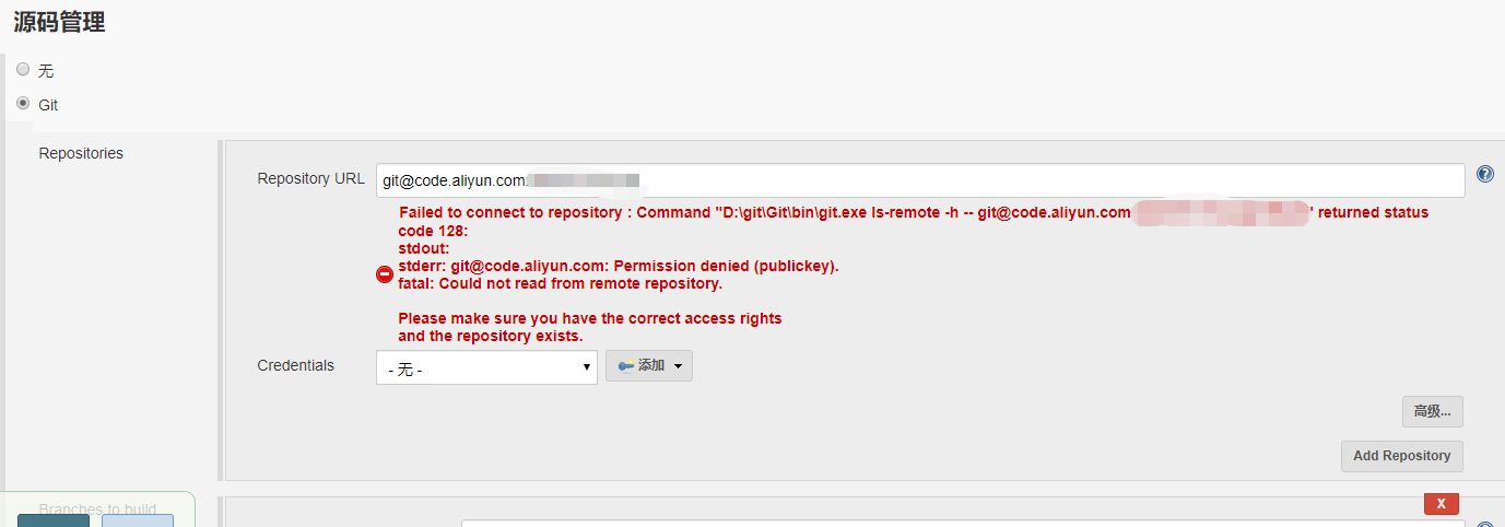 问题描述:在jenkins上源码管理输入git地址时,提示:Failed to connect to repository : Command "D:\git\Git\Git\bin\git.exe ls-remote -h -- git@code.aliyun.com:hzbl/iot-cloud.git HEAD" returned status code 128: