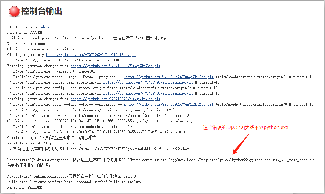 问题原因:因为python.exe的路径配置错了,导致jenkins无法调去python.exe
