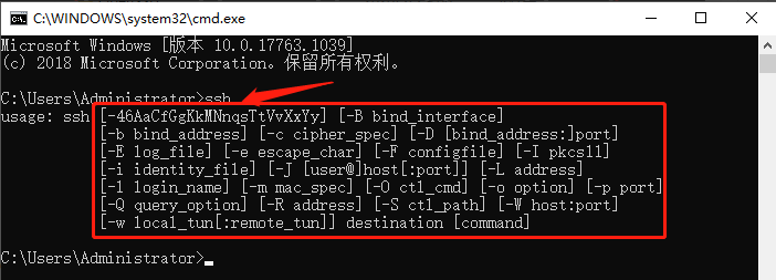 (3)安装成功后,打开cmd窗口,输入ssh命令,若出现如下所示,则说明安装成功
