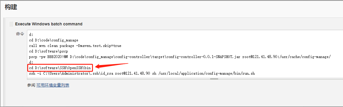 (4)在jenkins的脚本命令中,要将ssh.exe的绝对路径加上