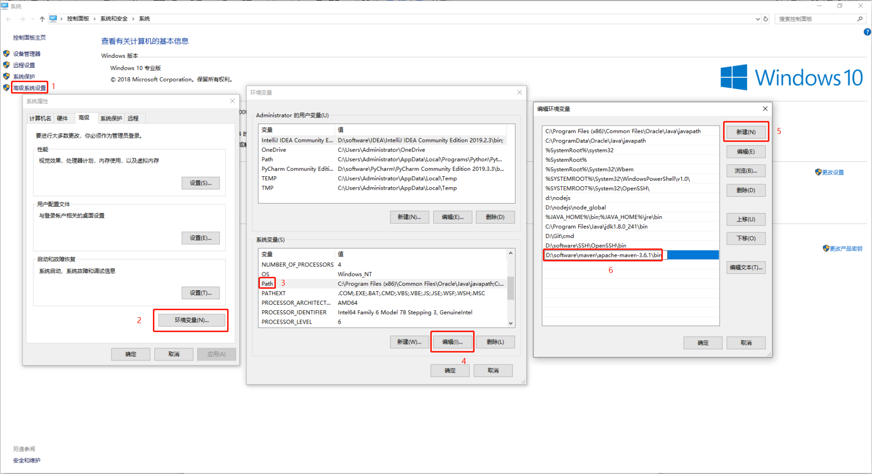(2)在电脑桌面,鼠标右键“我的电脑”—>“属性”—>“高级系统设置”—>“环境变量”—>选择“系统变量”—>找到Path,然后“编辑”将D:\software\maven\apache-maven-3.6.1\bin的绝对路径添加进去