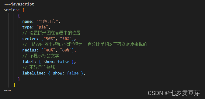 - 修改内圆半径和外圆半径为 ["40%", "60%"] 友情提示,带有直角坐标系的比如折线图柱状图是 grid修改图形大小,而我们饼形图是通过 radius 修改大小