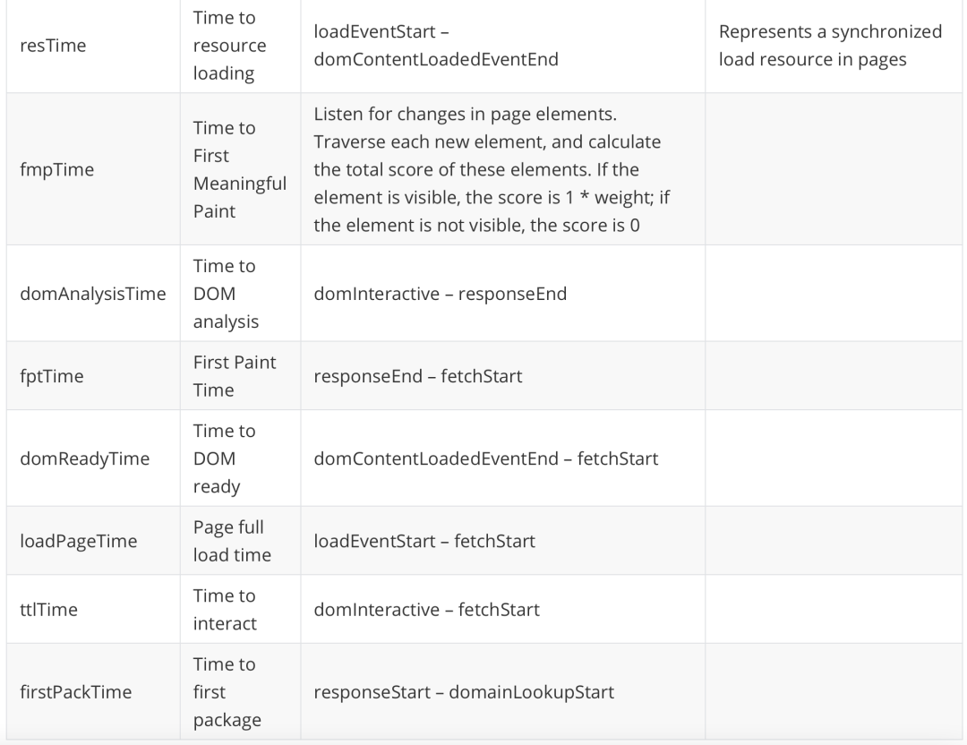 skywalking-client-js 使用 window.performance[3] 来收集性能数据。从 MDN 文档来看,性能接口提供了对当前页面的性能相关信息的访问。它是 High Resolution Time API 的一部分,但对 Performance Timeline API[4]、Navigation Timing API[5]、User Timing API[6] 和 Resource Timing API[7] 有所增强。
