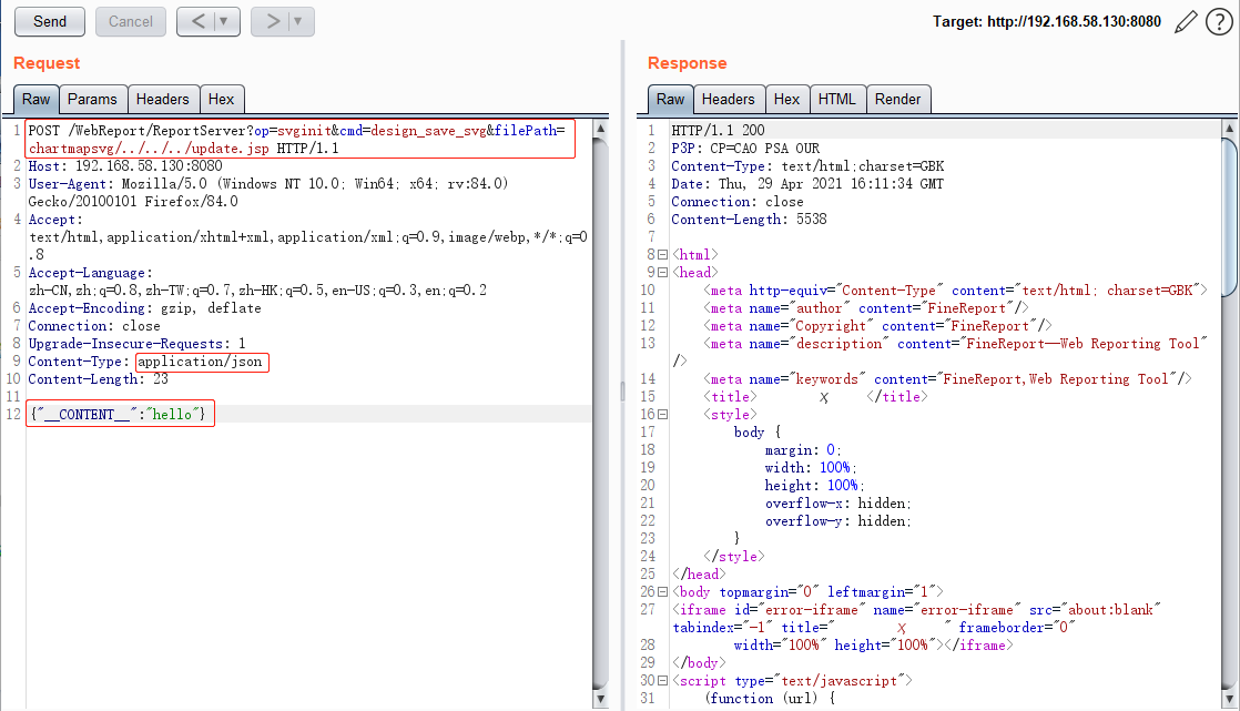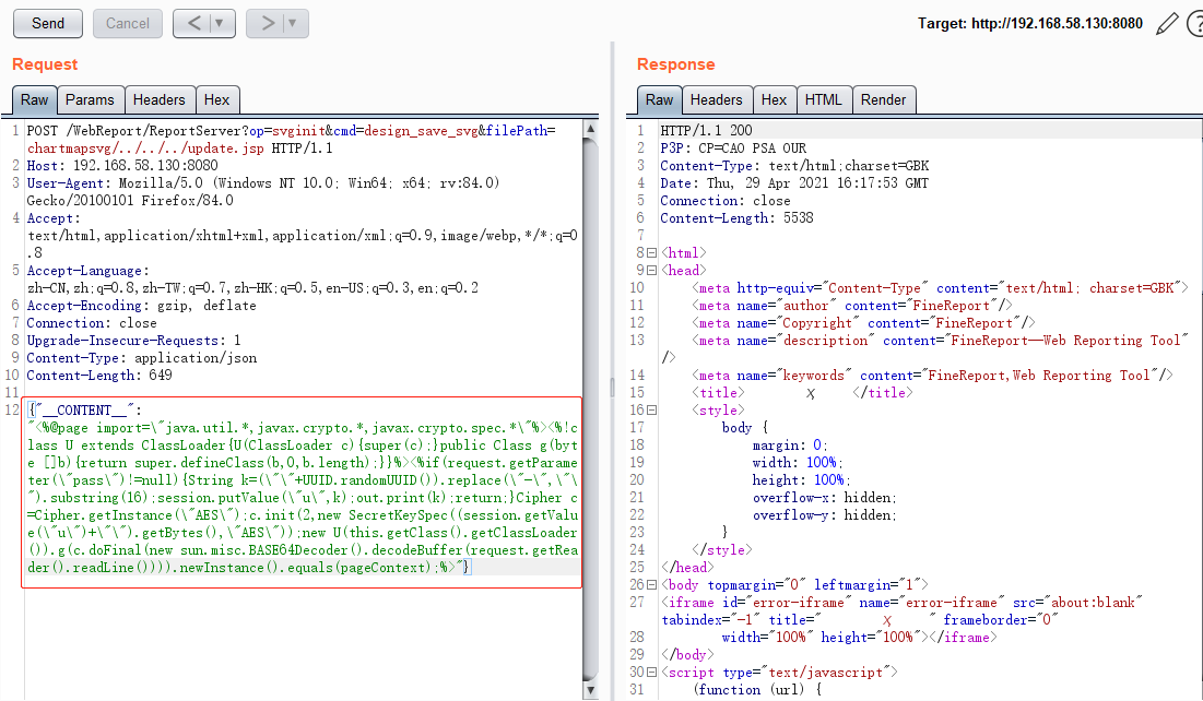 由于WebReport V9在安装之后在WebReport目录下存在update.jsp和update1.jsp,因此可以构造payload直接覆盖这两个文件的内容,从而GetShell。构造如下Payload覆盖update.jsp文件内容: