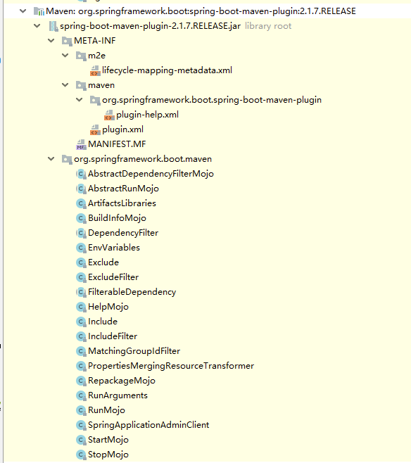 从上面的依赖,可以看出,基本都是插件需要的依赖。然后再idea中找到spring-boot-maven-plugin依赖包,打开依赖包,可以发现结构如下:
