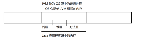 JVM的内存空间分为栈区、堆区、方法区 (属于Java应用和JVM之间的概念)