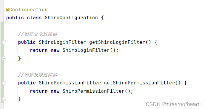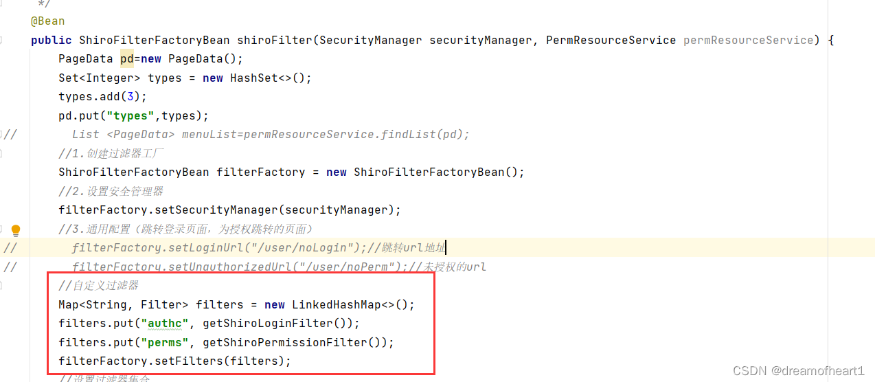 先说一下思路,需要自定义过滤器,登录认证的需要继承FormAuthenticationFilter,授权的需要继承PermissionsAuthorizationFilter,并重写里面的 onAccessDenied 方法,shiro过滤器不是链式调用,所以判断逻辑要重新写,就是判断权限时需要先写判断登录的逻辑;最后需要在shiro配置类中注入自定义的过滤器;具体代码如下:
