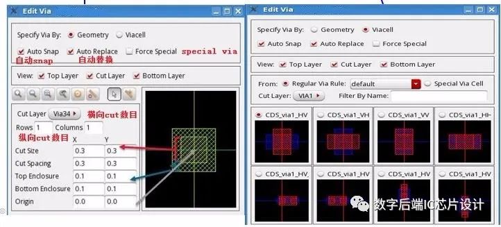 ,快捷键是O。wire edit也支持对Via的编辑。同样地,我们可以支持编辑regular via和special via。点击F3出现设置界面。我们可以根据Geometry来自已定制via或者根据选择库中已有的via cell。对应的命令是editAddVia。