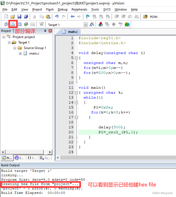 这就是我们刚刚C语言的代码被转换成了计算机所能识别的文件了,虽然我们看不懂HEX文件的含义,但在计算机眼里,这就是让他做流水灯的指令。