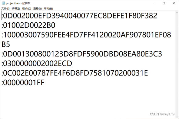 我们可以去流水灯工程的路径下找到这个HEX文件,用记事本打开给大家看看里面是什么。