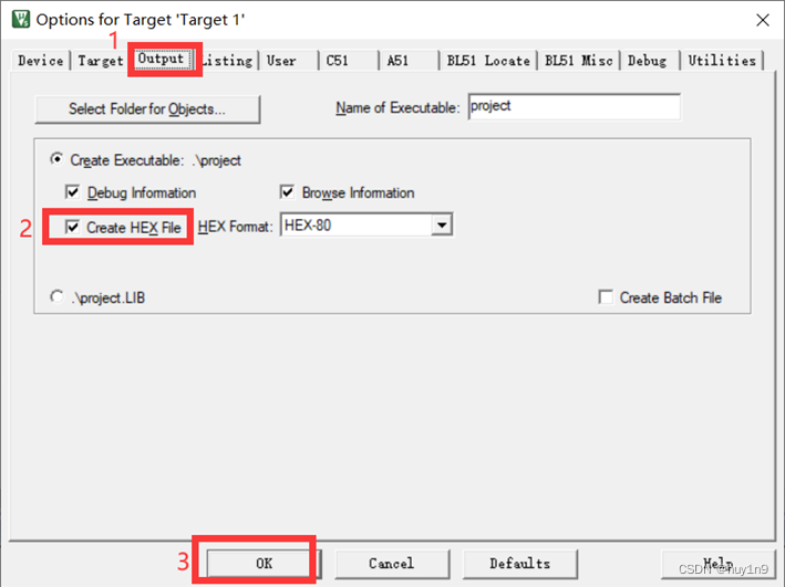 这个魔法棒很重要,里面有很多重要的设置,大家可以多摸索摸索,可以看到我们的2步骤是Create HEX File,翻译一下就是创建HEX文件,HEX文件其实就是机器代码,也就是计算机可以识别的文件了。