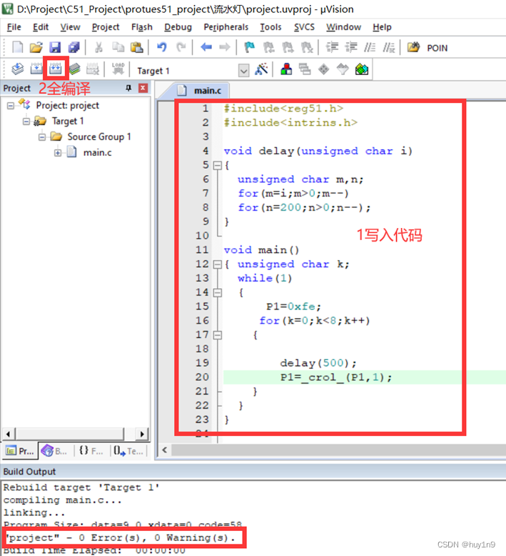 首先我们要新建一个工程,打开Keil新建一个名为LED的工程,在下面的代码复制到main.c里。新建工程上一章详细讲过了,不知道怎么建工程的同学见第二章。我的代码将下面的代码复制到工程里,再进行初步编译,看看代码是否会报错。