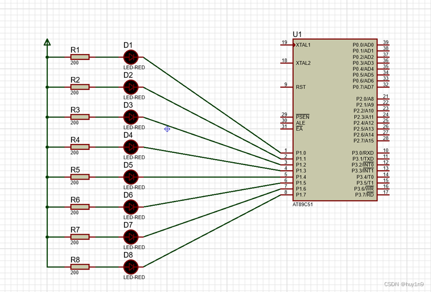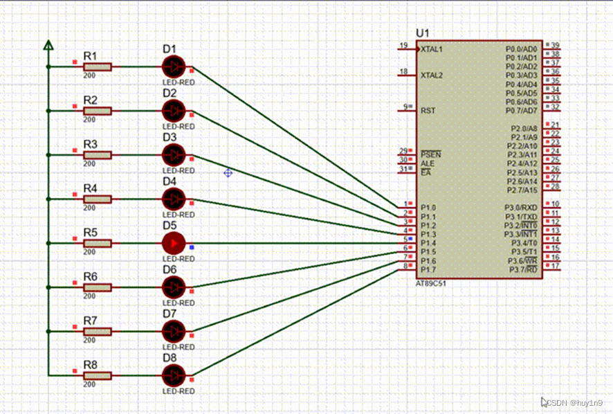 首先,介绍下流水灯的原理,下图为我们这个工程的原理图。其中主要包括51单片机芯片和流水灯模块,流水灯模块接在了单片机的P1口,200欧电阻是用来保护电路的。由原理图可以知道,我们可以看到LED的左边接了电源(高电平),在P1口给一个低电平即可点亮LED灯。相反,如果要LED灯熄灭,就要把P1口的电平变为高电平即可。要实现流水灯功能,我们只要将LED1~LED8依次点亮、熄灭,以此类推,8只LED变回一亮一暗的做流水灯了。