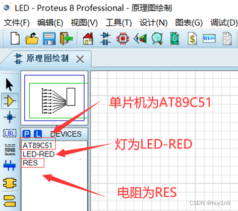 大家可以打开Proteus新建一个名为LED的工程,然后照着我的硬件图进行连接,需要用到的元器如下图,大家可以在元件库(点击P按钮进入元件库,上一章讲过的)里面搜索。