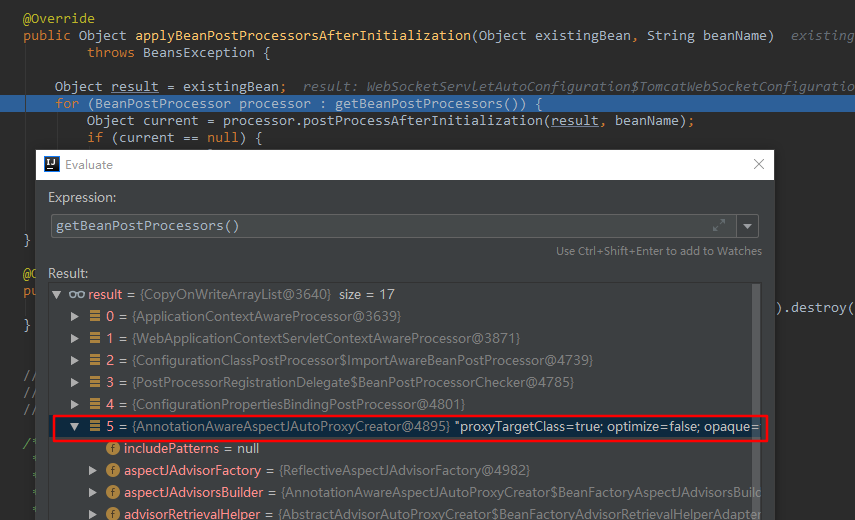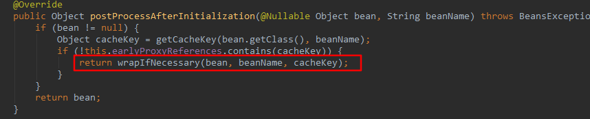 顾名思义,它是一个基于注解的“代理创建器”。我们猜测,代理类的创建就是在这个后置处理器中进行的。它的postProcessAfterInitialization() 方法如图所示。