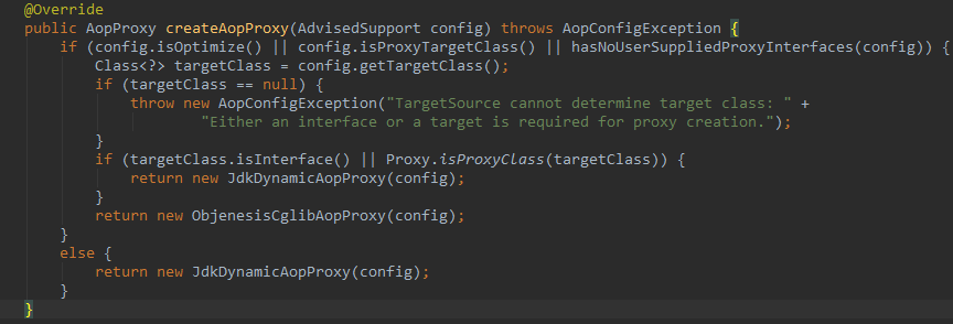 上面的 getProxy() 方法先是会调用 createAopProxy() 方法创建一个 AopProxy 对象,然后将创建代理的任务委托给 AopProxy 对象来执行。AopProxy 本身是一个接口,它主要有两个实现类:一个是 JdkDynamicAopProxy,一个是 ObjenesisCglibAopProxy。顾名思义,前者使用 JDK 动态代理技术,后者使用 CGLib 动态代理技术。 createAopProxy() 方法会根据条件选择使用哪种动态代理技术,具体实现如图所示。