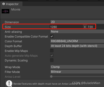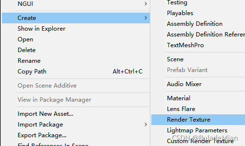 Project视图 鼠标 右键 -Create-Render Texture,自定义名字为Movie